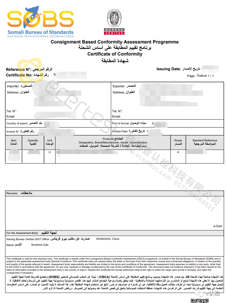自2023年7月15日起,所有进入索马里境内的货品,需要由索马里标准局(即SoBS,全称为Somalia Bureau of Standards)官方授权发证的CBCA证书,未获得CBCA证书的管制产品将受到入境限制。