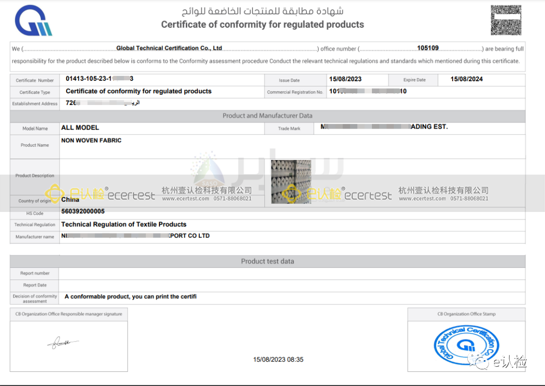 在每次出货时,再申请SABER/SC证书即可。(在申请SABER/PC证书时,除了需要提供产品测试报告,还需要进行审厂。我公司可以提供SABER/PC认证,IECEE认证) 下图为COC证书样本: