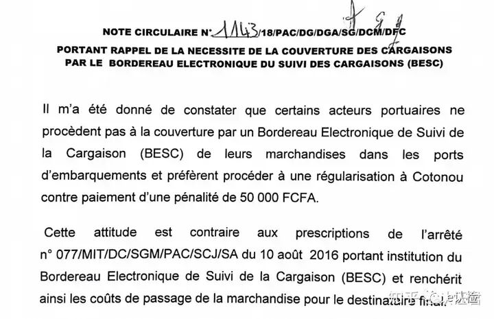 ● 没有BESC或在BESC上有虚假信息的货物将收取贝宁国家港务局规定的大量费用;