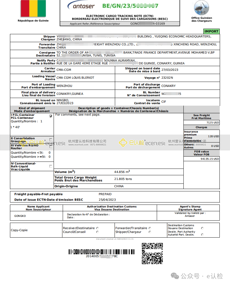 根据GUINEA几内亚港务局法令,所有发货至几内亚科纳克(CONAKRY/KONAKRY)港或经由此港转往马里等其他目的地的货物都必须申请ECTN(BESC)电子货物跟踪单。如果没有申请,将被视为触犯几内亚的条例,并在目的港受到严厉惩罚。