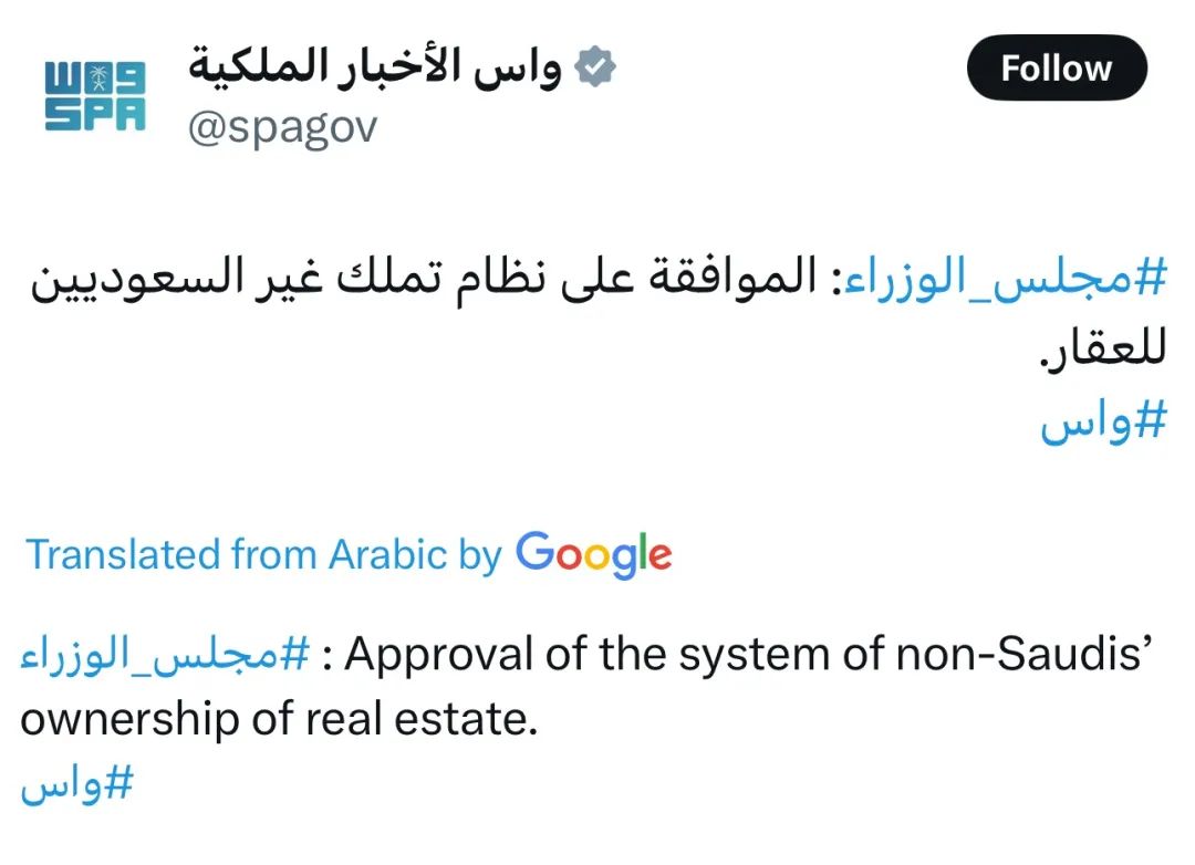 沙特市政、农村事务与住房大臣 Majid bin Abdullah Al-Hogail 指出,这一新政是沙特房地产领域改革的一部分,目的是吸引外国投资、增加市场供应,并促进该行业的整体发展。
