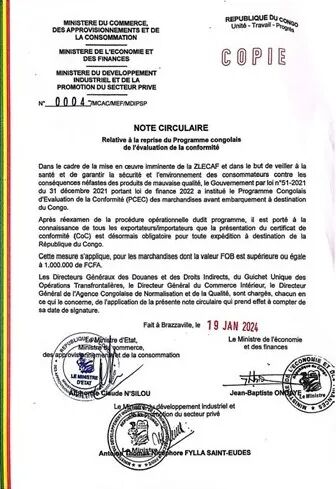 刚果(布)工业发展与促进部、经济贸易部、财政部发布正式通知,确认自2024年2月1日(提单日)起强制实施PCEC符合性评定项目。