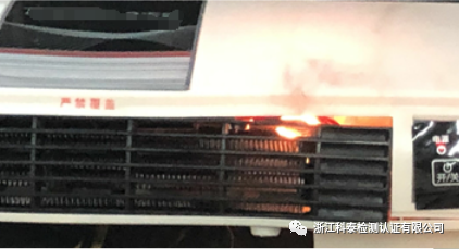 室内加热器进行第19.113试验,试验期间,喷射出火焰,不符合GB 4706.1-2005和GB 4706.23-2007标准第19.13条款“在试验期间,器具不应喷射出火焰”的要求。