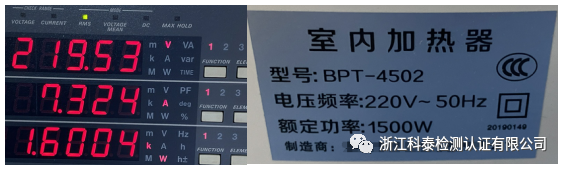 器具额定功率为1500W,实测功率为1600W,偏差为+6.7%超出标准限值(≤+5%,≥-10%),不符合GB 4706.1-2005和GB 4706.23-2007标准第10.1条款“器具在正常工作温度下,其输入功率对额定输入功率的偏离不应超出表1中所示的偏差”的要求。