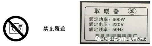 器具上缺少标有结合ISO 3864禁止标识(颜色除外)的IEC 60417-5641(DB:2002-10)符号或标上下述内容:“警告:禁止覆盖”,不符合GB 4706.1-2005和GB 4706.23-2007标准第7.1条款“器具应标有结合ISO 3864禁止标识(颜色除外)的IEC 60417-5641(DB:2002-10)符号或标上下述内容:‘警告:禁止覆盖’”的要求。